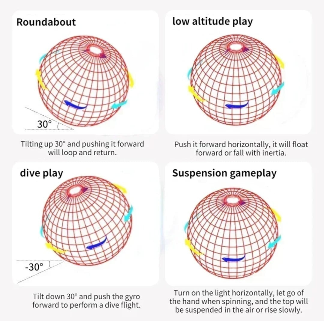 This toy is super easy to use! Just **turn it on, make sure the "Up" logo is facing up**, and give it a shake to activate. Toss it at a **30° upward angle to make it boomerang back**, or throw it downward for a **straight flying effect**. Want to stop it? A simple shake is all it takes. Great for kids and adults who love **cool gadgets with a touch of magic**!